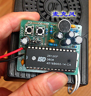 這是我們最新開發(fā)的120秒語音錄放模塊ISD25120,上圖中紅線接+5V,黑線接地,板上有CE和PD兩個輕觸開關(guān),用于播放和停止控制,在按鈕下方是錄音/放音切換跳線,戴到左邊的P一側(cè)表示處于放音模式,戴到右邊的R一側(cè)表示處于錄音模式,現(xiàn)在提供的模塊無圖片中的黑色外殼,請注意。