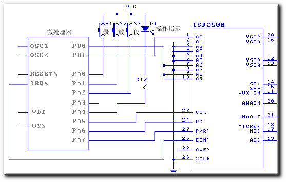 ISD2500的按鍵單段錄放電路非常簡單見上圖,單段使用時全部地址線接地,錄音時置P/R端(S3)為低,按住不放CE端的片選鍵(S1),即開始錄音,松鍵時或芯片錄滿時自動停止。放音時置P/R端(S3)為高,按一下CE端的片選鍵(S1),即開始放音,按一下PD端的節(jié)電鍵(S2)或放音結(jié)束時自動停止。