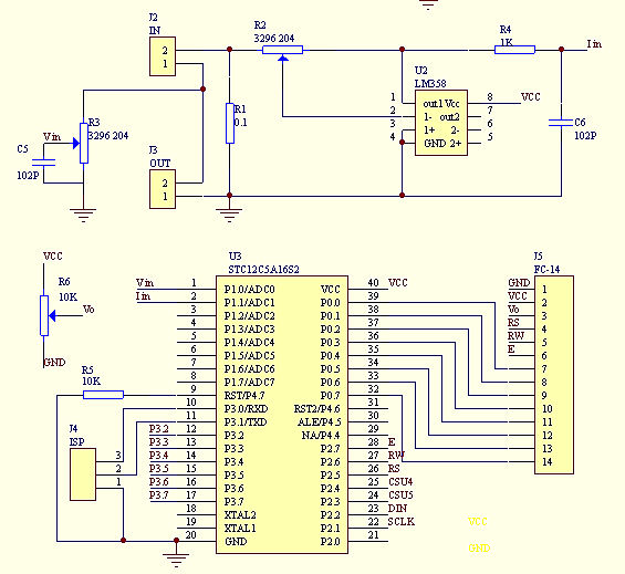 我們采用LM358作為兩個輸入通道的緩沖放大,采用單片機(jī)內(nèi)部的AD轉(zhuǎn)換功能,精度一般(畢竟10位的AD只有1024分之一的分辨率,0~50伏電壓最高也就是0.05伏的分辨率了,所以選擇了0.1作為最低分辨率)不過一般場合已經(jīng)足夠,起碼比指針表要強不少了,如果測量電壓的話直接接入J2的插座中,如果還要測量電流,可以將板上的0.1歐姆大功率電阻串入回路,電路會自動根據(jù)電壓和電流計算出消耗的功率并顯示出來。
