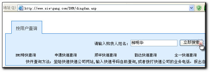 如果客戶要查看網(wǎng)站是否發(fā)貨的話進(jìn)入訂單查詢網(wǎng)頁,在請(qǐng)輸入購(gòu)貨人姓名后面輸入姓名“柳明華”點(diǎn)擊“立即搜索”按鈕,就能查到“柳明華”客戶的所有訂單。