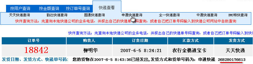 訂單顯示:已經(jīng)發(fā)貨,發(fā)貨方式為 申通快遞,快遞單號(hào)為268280176613,見上圖中紅色橫線的位置。