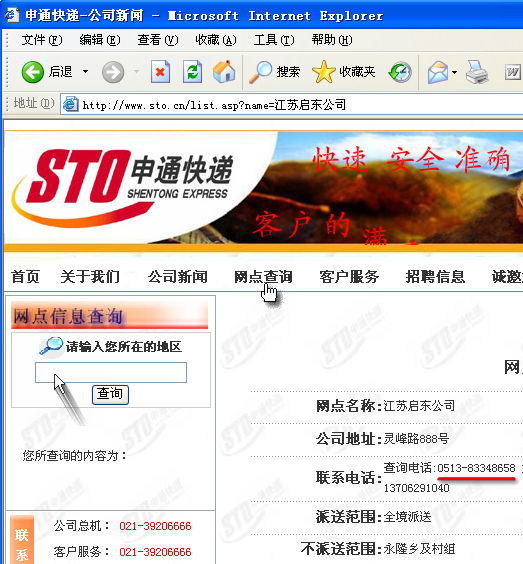 如果貨物已經(jīng)到目的地但客戶沒收到貨物,或者時(shí)間超時(shí)(3天以上)客戶也可以直接打電話給當(dāng)?shù)氐目爝f公司,報(bào)出快遞單號(hào)碼進(jìn)行詢問,例如,點(diǎn)擊“網(wǎng)點(diǎn)查詢”,找到客戶本地申通快遞的查詢電話,然后報(bào)出快遞單號(hào)碼詢問。