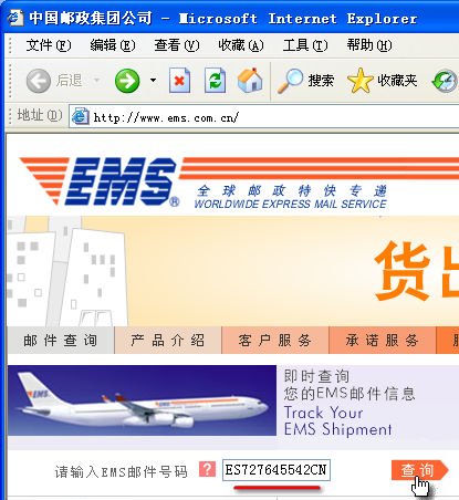 這里我們?cè)僖脏]政特快專遞EMS查詢,假設(shè)EMS單號(hào)為:ES727645542CN