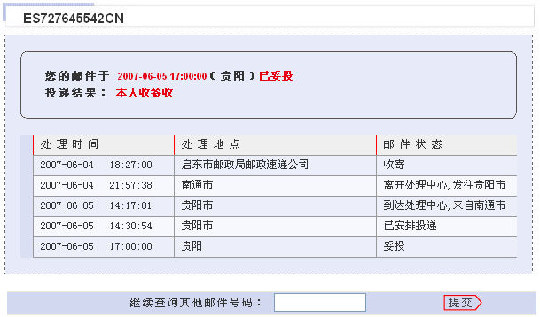 輸入單號(hào),可以用復(fù)制-粘貼的方法,如果需要輸入校驗(yàn)碼請(qǐng)輸入,點(diǎn)擊查詢按鈕,查詢顯示快遞是6月4號(hào)18:27分收寄的,在5號(hào)17:00貴陽的客戶已經(jīng)本人簽收了,看來國(guó)家的快遞效率還是比較高的,如果有問題客戶可以撥打11185電話,報(bào)出EMS的單號(hào)進(jìn)行詢問。