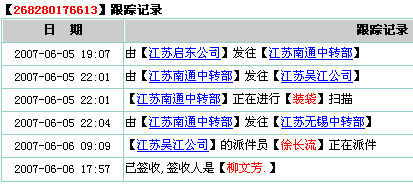 查詢結(jié)果顯示快件是6月5號(hào)19點(diǎn)07分從啟東發(fā)貨的,客戶在吳江16號(hào)17點(diǎn)57分收到貨物的,并且已經(jīng)簽收。