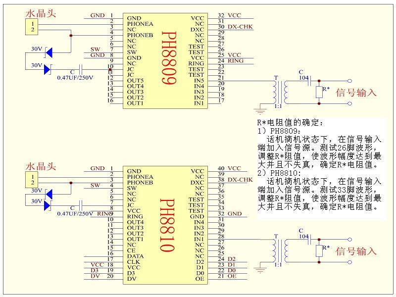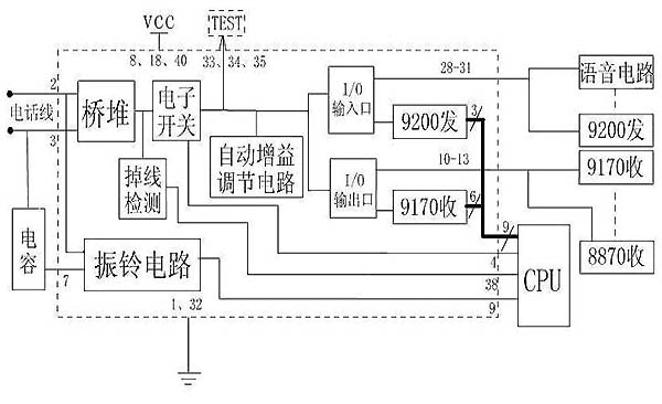 輸出到電話線上語音信號在電平幅度較大時可以從28-31端輸出、電平信號較小時可以從帶有自動增益控制的10-13腳的任意一腳輸出到電話線上。