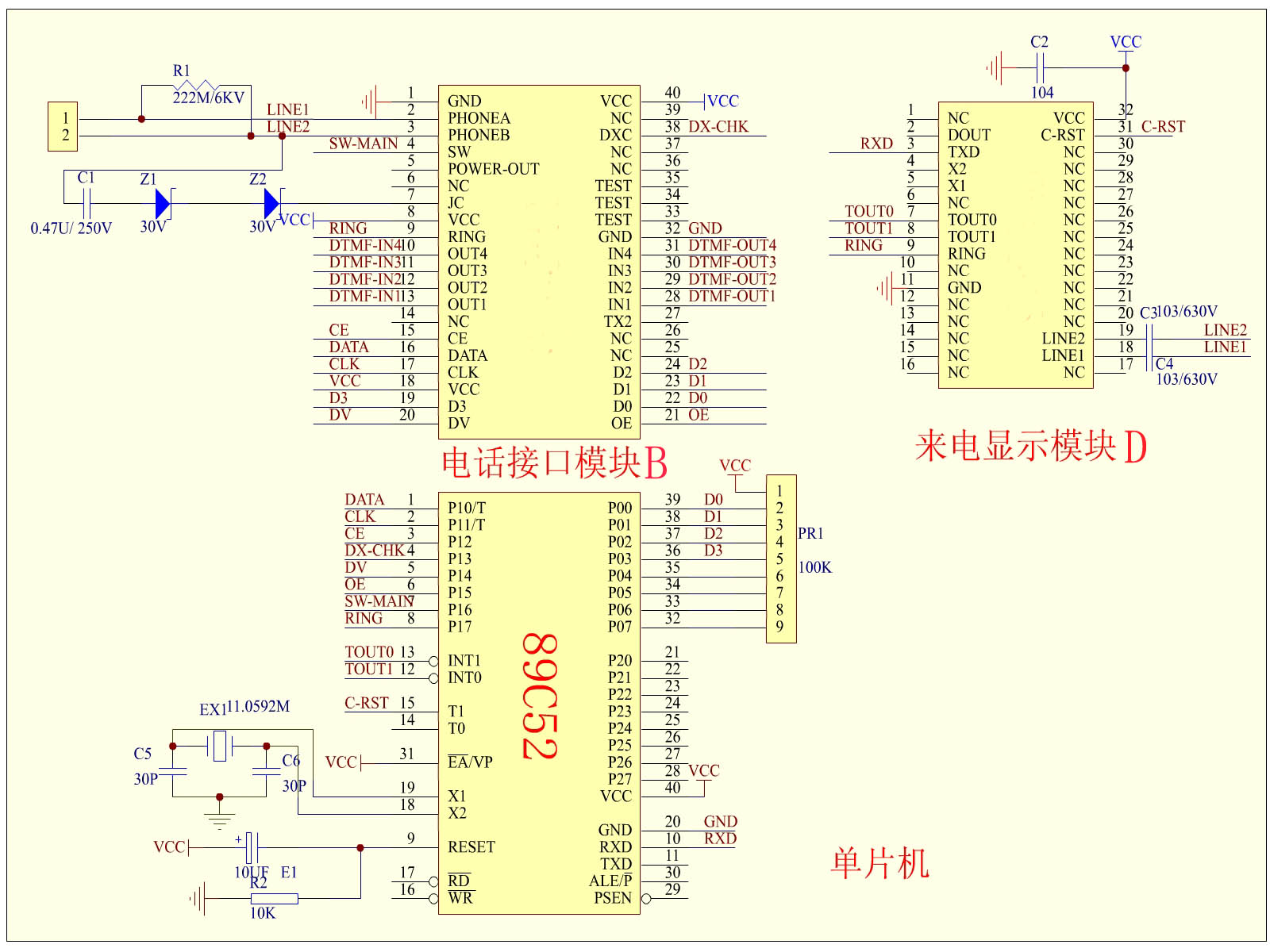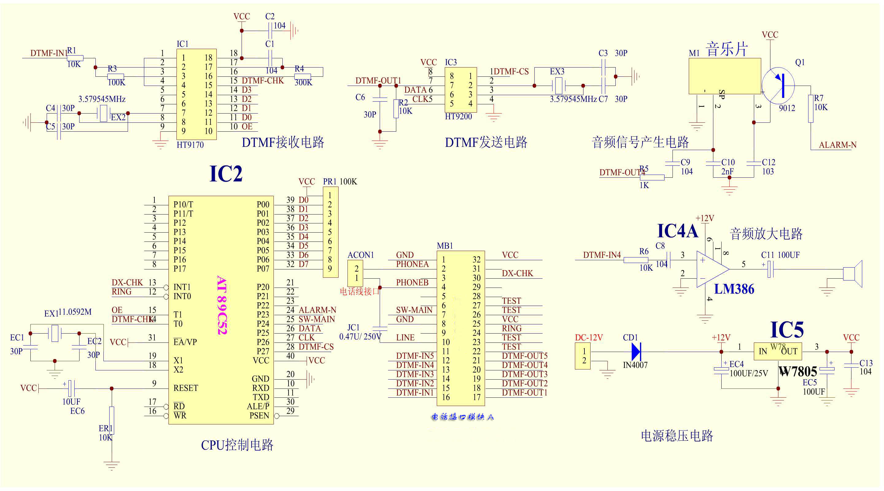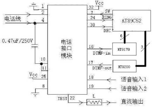 電話接口模塊的1腳接電源地;32、25腳必須同時連接到電源+5V; 2、4腳連接電話線; 10或11腳接一0.47uF/250v的電容到4腳,用于檢測振鈴信號; 30腳斷線檢測連接到CPU用于電話線斷線檢測;7腳是摘、掛機(jī)控制端。CPU可以通過設(shè)置高低電平,實現(xiàn)摘掛機(jī)功能(高電平摘機(jī),低電平掛機(jī));16腳是DTMF信號輸出到DTMF解碼芯片(HT9170)的端口;17腳用于DTMF發(fā)送芯片(HT9200)發(fā)出的信號輸出到電話線上的端口;18腳或19腳用于向電話線傳送語音信號的端口;22腳為備用測試端;