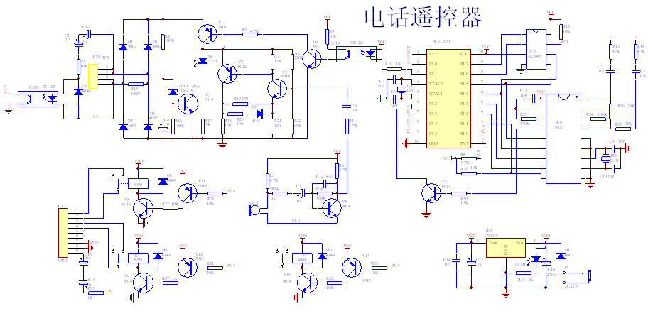 電話(huà)遙控監(jiān)聽(tīng)器的電路原理圖,如圖1所示。電路的核心元件是ATMAL公司的一塊89C2051單片機(jī)(最新產(chǎn)品已經(jīng)換成STC12C2052單片機(jī),并具備IC6的功能)。它擔(dān)負(fù)信號(hào)和數(shù)據(jù)的采集、分析運(yùn)算、輸出控制等工作。