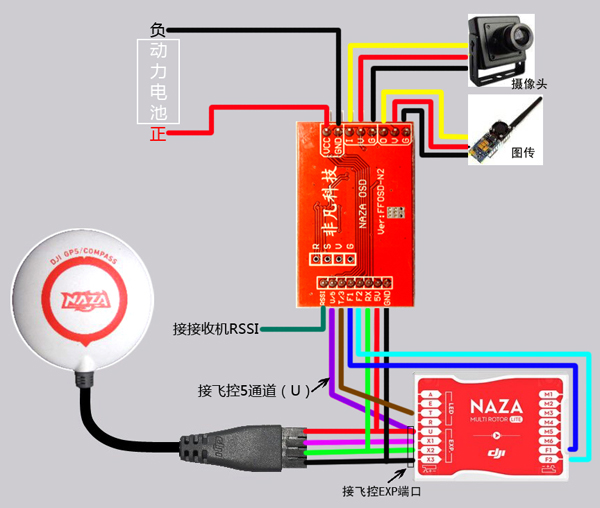 1.將OSD模塊上的2芯插件分別和NAZA的F1和F2連接。
