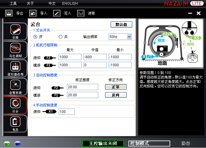 2.進(jìn)入NAZA的調(diào)參軟件,把云臺(tái)選項(xiàng)頁(yè)面設(shè)置成如下圖顯示的參數(shù)