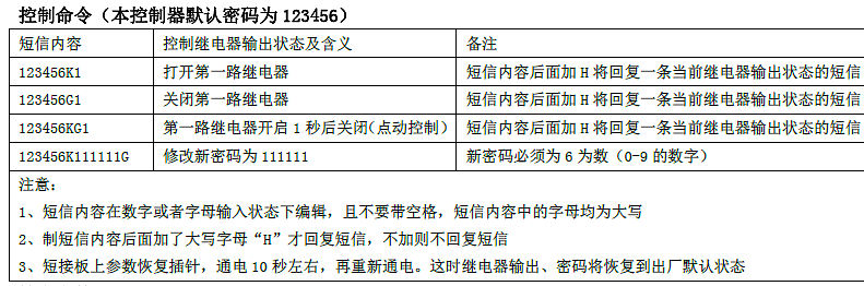 在手機(jī)上將SIM卡收件箱清空。將SIM卡插入本控制器(安裝和取下SIM卡時(shí)需斷開控制器電源),接通控制器電源,大約10秒鐘后,控制器將搜索到GSM信號(hào)。撥打本SIM卡號(hào)碼,以確認(rèn)控制器是否加入GSM網(wǎng)絡(luò)。由于短信有一定的延遲時(shí)間,所以在發(fā)送控制短信后會(huì)一般會(huì)過2分鐘左右控制器才能有相應(yīng)動(dòng)作。