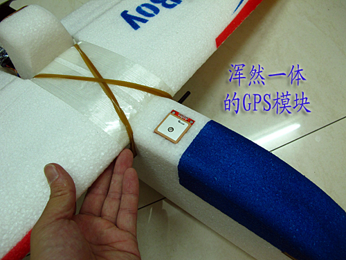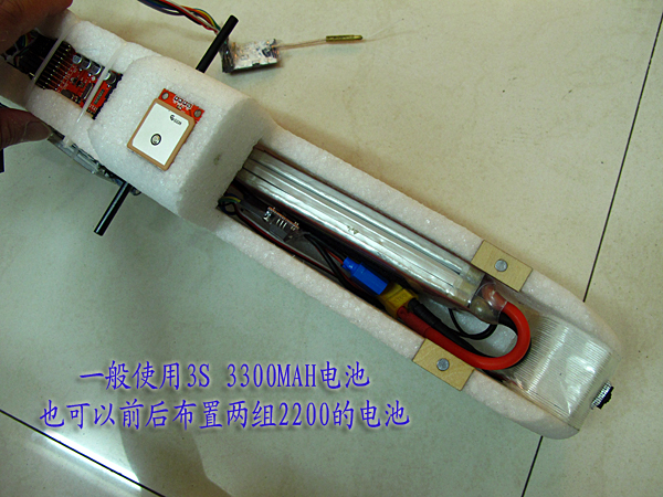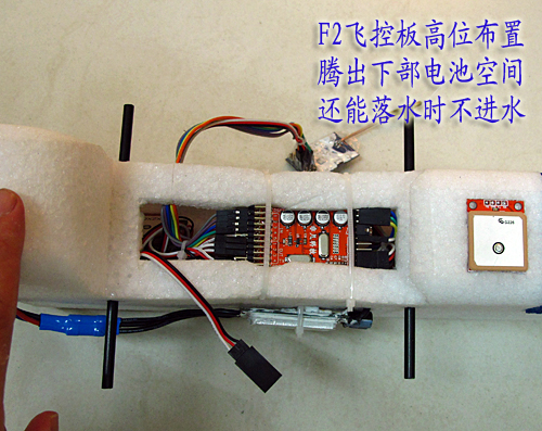 F2飛控我們安裝在機翼下面,位于飛機重心處,并正好卡在機艙中間,前后輸出線組用扎帶固定防止受力松脫,因為位置較高,所以即使飛機掉入水中(一般是機頭前端沉入水中),飛控還在水面上方飛機也能開回來,GPS模塊安裝在機翼前端,嵌入EPP泡沫中渾然一體,并且纏繞透明膠帶做防水處理。電流傳感器直接焊接并用透明熱縮套封固。