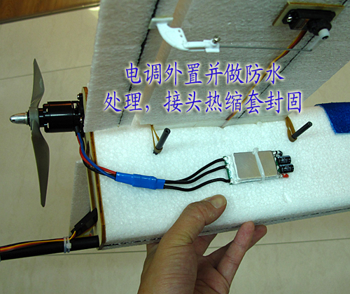 雖然2212的動力也能飛,但是出于FPV安全性考慮我們還是選用朗宇的2216電機,KV1400配合APC的8060螺旋槳,充足的動力可以應變突發(fā)情況,即使五級風也能安全飛行。電調(diào)選用好贏的40A 必須是UBEC的,它屬于高效開關(guān)穩(wěn)壓,發(fā)熱少可靠性高。3A的輸出電流可以滿足F2飛控和四個舵機供電。電機和電調(diào)之間的插頭必須用熱縮套封固防止松脫,電調(diào)去掉封套用704硅膠做防水處理,外置在飛機外面便于散熱并留出倉內(nèi)空間。