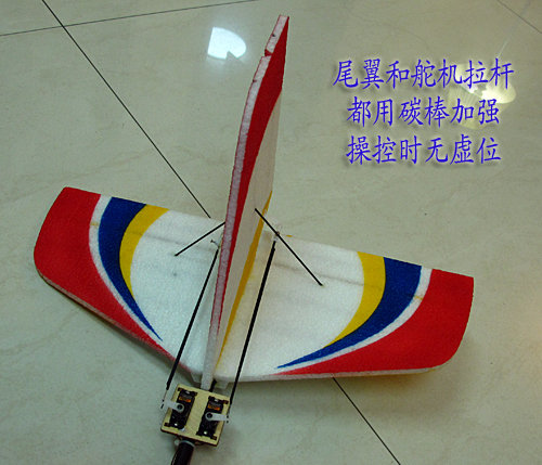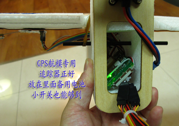 遙控接收機用703膠水做防水處理,輸出線用扎帶固定后封透明熱縮套,并且移出機艙固定在機翼下面,可以遠離電機、電調(diào)和追蹤器等干擾源,提高接收靈敏度。經(jīng)過這樣處理即使是天地飛7的原裝遙控距離在1300米左右開始陸續(xù)失控。
