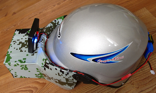 這是我們自行設(shè)計制作的FPV專用頭盔視覺系統(tǒng),能實時看到飛機上傳回的畫面,最大的好處是不受周圍強烈陽光的干擾,轉(zhuǎn)動頭部可以讓平板始終對準飛機,比三角架+顯示器方案方便便攜。