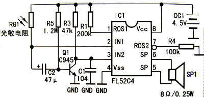 本產(chǎn)品采用光敏電阻來檢測環(huán)境光線,當(dāng)有人靠近迎賓器時(shí),由于人體遮擋住部分光線,光敏電阻采集到的光線強(qiáng)度由強(qiáng)變?nèi),?jīng)C2耦合后經(jīng)Q1三極管高增益放大后輸入IC1的反相輸入端,這個(gè)信號(hào)和同相輸入的信號(hào)在IC1內(nèi)部運(yùn)算放大后形成觸發(fā)信號(hào),驅(qū)動(dòng)語音電路工作,發(fā)出“你好!歡迎光臨!”的女聲然后又自動(dòng)進(jìn)入低功耗守候狀態(tài)。光敏電阻裝入一根黑色的塑料管中,可以很好地避免環(huán)境光線的干擾,并且保證只檢測正前方光線的變化,確保動(dòng)作靈敏可靠。