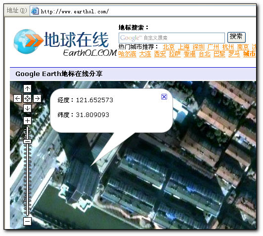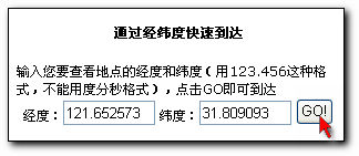 登陸地球在線網(wǎng)站,只要輸入經(jīng)緯度,例如 東經(jīng):121.652573 北緯:31.809093 就能準(zhǔn)確定位。