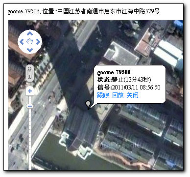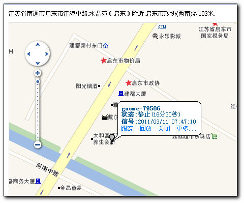 目標(biāo)車輛已經(jīng)出現(xiàn)在電子地圖中了,信息非常詳細(xì)清楚,如車輛在地圖上的位置,是靜止的還是運(yùn)動的,文字描述周圍的標(biāo)志性建筑物,通過點(diǎn)擊“回放”按鈕可以動畫顯示特定時(shí)間段內(nèi)的車輛運(yùn)動軌跡,點(diǎn)“運(yùn)行統(tǒng)計(jì)”按鈕可以查看車輛的更多信息。