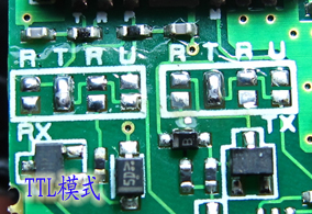 我們的產(chǎn)品提供兩種接口方式,一種是RS232接口,可以直接連接電腦的9針串口,串口頭上另外引出的兩根導線是電源線,紅線接3~5V的直流正極,黑線接電源地(負極)如果希望直接和單片機通訊需要切換到TTL電平輸出,可以打開模塊的外殼,將內(nèi)部原來的4個R焊點開路(拆除4個0歐姆短路電阻)將2個T焊點短路即可(請參考下圖)。