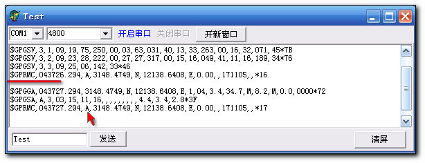 GPS模塊默認每秒輸出一次TTL的NMEA-0183信號。例如:$GPRMC,040936.626,A,3148.4753,N,12138.6459,E,013.6,180.54,100404,,*1APS