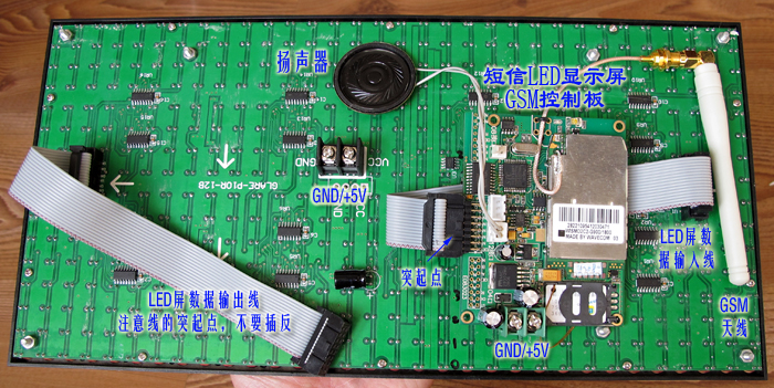 每塊LED單元板都有一個數(shù)據(jù)輸入口(插座旁有一個向內(nèi)的箭頭),一個數(shù)據(jù)輸出口(插座旁有一個向外的箭頭。用數(shù)據(jù)排線先把短信LED控制卡的數(shù)據(jù)輸出口和一塊LED單元板的數(shù)據(jù)輸入口相連,再把這塊LED單元板的數(shù)據(jù)輸出口和下一塊LED單元板的數(shù)據(jù)輸入口相連,如此把多塊LED單元板相連。一個短信LED控制卡最多可以帶動11塊LED單元板。