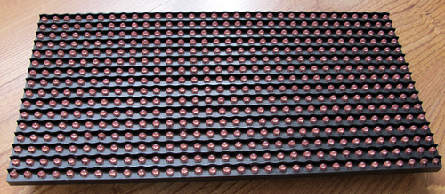 這是半戶外的P10 LED顯示屏,每個大小為32*16厘米,上下LED之間設(shè)計有遮光沿,可以提高顯示清晰度。我們的控制主機最多允許同時驅(qū)動11個LED顯示單元,可以組成352*16厘米的顯示區(qū)域,非常清晰醒目,能在20米外看清楚。