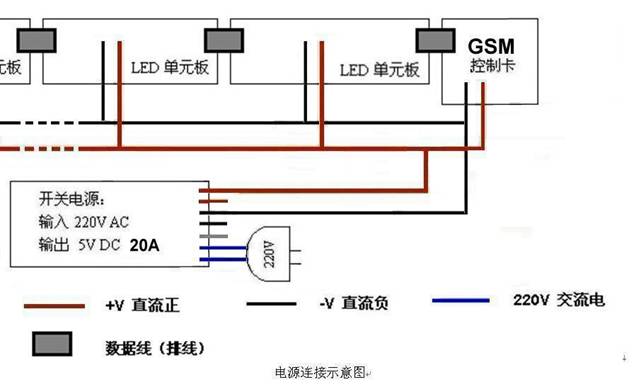 先把開關(guān)電源關(guān)閉。用紅色線連接到開關(guān)電源的V+接線柱上,再分別連接到GSM控制卡的+5V接線柱和每塊LED單元板的VCC接線柱上;用黑色線接到開關(guān)電源的V-(COM)接線柱上,再分別連接到GSM控制卡的GND接線柱和每塊LED單元板的GND接線柱上。完成后,請檢查連接是否正確。