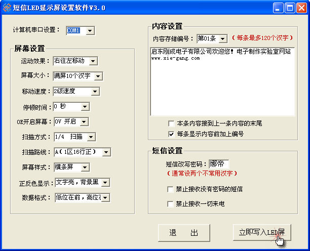 短信LED控制卡出廠時的改寫密碼為“娜帝”,在上面介紹的設(shè)置軟件中能夠更改密碼。知道了密碼就能用手機短信來改寫LED屏幕內(nèi)容,具體短信格式如下: