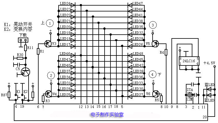 這是我們早期產(chǎn)品的電路原理圖,最新產(chǎn)品已經(jīng)做了一些改動,采用31LED顯示圖形,由一片24腳的單片機(jī)直接驅(qū)動,圖中黑色是滾珠開關(guān)K1,用于判斷搖晃速度并自動適應(yīng)顯示頻率。