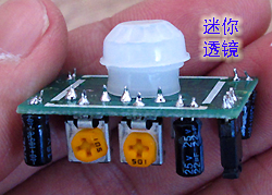 這款模塊的性能和產(chǎn)品3完全相同,只是這款的紅外透鏡不同可以直接戴在熱釋電元件上,并且透鏡的直徑只有13毫米,比較隱蔽并便于在外殼上開孔,能更容易嵌入到其他設(shè)備中。