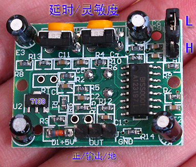 模塊有三個(gè)輸出腳,標(biāo)有“+5V”的是正電源,標(biāo)有“GND”的是地,標(biāo)有“OUT”的是輸出腳,有人活動(dòng)輸出3V高電平,無人輸出0V低電平,圖中右上角有一個(gè)觸發(fā)模式切換跳線帽,中間和H連接為重復(fù)模式,只要檢測(cè)區(qū)域有人模塊就一直有輸出,這種模式一般稱為電平輸出,中間和L連接為不重復(fù)模式,這種模式下即使檢測(cè)區(qū)域有人活動(dòng)模塊也會(huì)自動(dòng)停止輸出一段時(shí)間(封鎖延時(shí))然后再檢測(cè),這種模式一般習(xí)慣稱為脈沖輸出。模塊上的105黃色電位器是動(dòng)作輸出延時(shí)調(diào)整,就是檢查到人體后輸出延時(shí)若干秒高電平信號(hào)的時(shí)間,調(diào)節(jié)范圍0.3秒~18秒,順時(shí)針延時(shí)變長(zhǎng),出廠默認(rèn)9秒。如果需要光控功能,可以在CDS位置接上一個(gè)光敏電阻,光敏電阻選市場(chǎng)常見的品種即可。