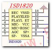模塊不需要單片機就能正常工作,同時也預留了預留6針單片機控制口。1820芯片的第10腳是ROSC采樣頻率設置電阻,錄音時間是隨著電阻改變的,比如用100K時,錄音時間是10S;用160K的電阻時,錄音時間是16S;為了提高音質,本模塊采用82K電阻,因此錄音時間為8.2S。