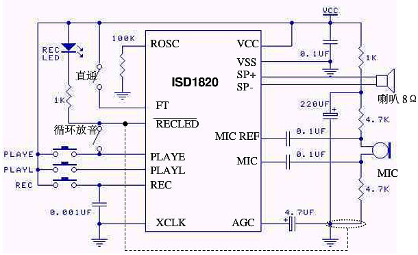 直通模式(FT):此端允許接在MIC輸入端的外部語音信號經(jīng)過芯片內部的AGC電路、濾波器和喇叭驅動器而直接到達喇叭輸出端。平時FT端為低,要實現(xiàn)直通功能,需將FT端接高電平,同時REC、PLAYE和PLAYL保持低。