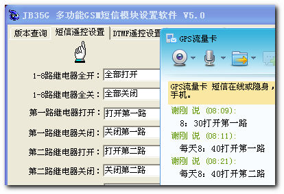 〈5〉 進(jìn)入待機(jī)狀態(tài)后,用另一部手機(jī)向JB35上的SIM卡號(hào)碼發(fā)一條短消息,內(nèi)容為“打開第一路,打開第二路,打開第三路,打開第四路,打開第五路,打開第六路,打開第七路,打開第八路。”JB35收到短信后,發(fā)光管LED1~LED8應(yīng)全亮,如外接有繼電器,8路繼電器都應(yīng)吸合。再發(fā)一條短消息,內(nèi)容為“關(guān)閉第一路,關(guān)閉第三路!盝B35收到后,LED1和LED3發(fā)光管滅,繼電器釋放,這就是短信遙控功能!暗谝宦反蜷_,第二路打開……”這些是默認(rèn)的短信遙控指令,具體指令可以參考出廠時(shí)默認(rèn)為“打開第X(中文的一~八)路”或“關(guān)閉第X(中文的一~八)路”。