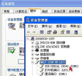 鼠標右鍵點擊桌面的“我的電腦”=》屬性=》硬件=》設備管理器=》端口 看下圖中是否出現(xiàn)紅色箭頭所指的CH340虛擬串口,如果不是CH340字樣,可能您的電腦安裝過類似驅動,請右鍵點“卸載”再重新安裝340的驅動即可。
