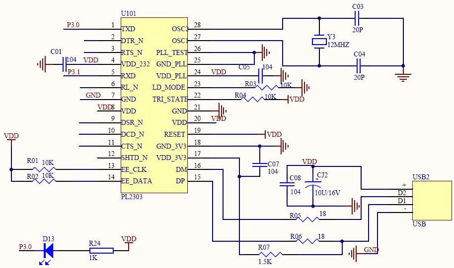 PL2303HX采用28腳貼片SOIC封裝,工作頻率為12MHZ,符合USB