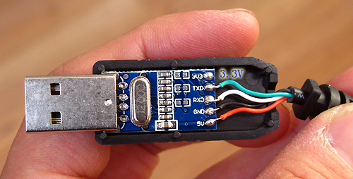 這是我們用PL2303模塊加上USB殼體加上1米的線并壓接好杜幫插頭后的成品,優(yōu)點是有外殼不容易意外短路,并且附帶的1米連接線足夠長,可以方便地插接到衛(wèi)星接收機或者用戶設備上,引線的材質比較好還不容易折斷,紅色VCC、黑線GND、白線P3.0 TXD、綠線 P3.1 RXD。預留了3.3V輸出端口。