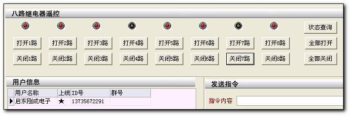 這時(shí)我們點(diǎn)擊上面的“打開(kāi)8路”按鈕,遠(yuǎn)端的第8路繼電器就會(huì)打開(kāi),同時(shí)控制成功后會(huì)返回一條指令把“打開(kāi)8路”按鈕上方的紅燈點(diǎn)亮,告訴操作者控制成功。點(diǎn)擊“關(guān)閉8路”按鈕,遠(yuǎn)端的第8路繼電器就會(huì)關(guān)閉,同時(shí)控制成功后會(huì)返回一條指令把“關(guān)閉8路”按鈕上方的紅燈熄滅,告訴操作者控制成功。
