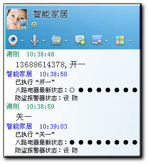 先用你的QQ先加主機(jī)里的QQ:2847405392為好友,它會(huì)自動(dòng)同意。然后和“智能家居”的好友對(duì)話(huà),向他發(fā)送以下內(nèi)容:13688614378,開(kāi)一(假設(shè)主機(jī)上的SIM卡號(hào)為13688614378