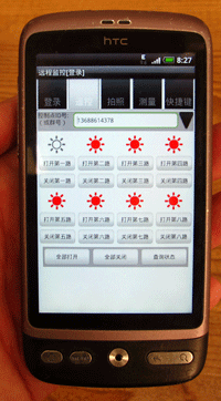 1)在“遙控”界面中的“控制點(diǎn)ID號(hào)”中輸入13735672291(客戶(hù)設(shè)備中的GSM號(hào)碼),點(diǎn)按繼電器按鈕就能遙控繼電器開(kāi)關(guān)。圖中的8個(gè)指示燈用來(lái)指示8路電器的開(kāi)關(guān),當(dāng)按下“打開(kāi)第一路”按鈕,手機(jī)軟件就發(fā)出指令到主機(jī)打開(kāi)第一路電器,控制成功后主機(jī)又返回確認(rèn)信息到手機(jī),手機(jī)軟件就把第一盞指示燈變紅。用戶(hù)只要看燈的變化,就能了解是否控制成功。