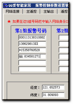 報(bào)警號(hào)碼可以設(shè)定主機(jī)報(bào)警后接收?qǐng)?bào)警信息的手機(jī)號(hào)碼和QQ號(hào)碼,在第1組報(bào)警號(hào)碼的第一行,輸入的是手機(jī)安卓軟件的本機(jī)網(wǎng)絡(luò)身份ID號(hào),前面必須加000,下面的經(jīng)緯度輸入報(bào)警安裝點(diǎn)的經(jīng)緯度,這樣一旦報(bào)警手機(jī)會(huì)自動(dòng)發(fā)出警報(bào)聲并跳出百度地圖,精確顯示位置,同時(shí)現(xiàn)場(chǎng)報(bào)警圖像立即顯示到安卓界面中。第二行輸入的是手機(jī)號(hào)碼,可以在報(bào)警時(shí)收短信或者接聽(tīng),第三行的號(hào)碼前面加*表示不會(huì)發(fā)彩信和短信。第四行是QQ號(hào)碼,報(bào)警時(shí)智能家居QQ會(huì)自動(dòng)發(fā)信息給你。