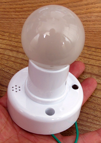 當(dāng)主機(jī)上的GPRS指示燈D3亮了后,就可以測(cè)試遙控電器的功能了。主機(jī)上的220V插座可以最大控制5A以?xún)?nèi)的負(fù)載,對(duì)應(yīng)的是第一路遙控通道上,官方標(biāo)配中有一個(gè)學(xué)習(xí)型遙控?zé)纛^,出廠時(shí)也已經(jīng)學(xué)習(xí)綁定到主機(jī)的第一路遙控通道上,用戶(hù)裝起來(lái)就可以遙控了。把學(xué)習(xí)型遙控?zé)纛^連接到燈泡和燈座中間(見(jiàn)下圖)。