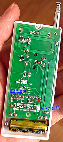 上表只列舉了呼叫器1~10編號(hào)的數(shù)據(jù)碼,主機(jī)包裝盒的背后有1~99的詳細(xì)編碼表,上表中的1表示對應(yīng)腳接高電平(H或者+表示),0表示對應(yīng)腳接低電平(L或者-表示)。