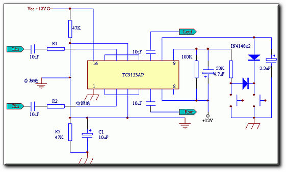 這是TC9153AP芯片的典型應用電路,該芯片其實就是一個電子電位器,R1、R2是輸入電阻,經試驗當電阻為47K時,用大動態(tài)CD片放音還會出現失真,當加大至68K后失真消失,所以可根據實際情況選擇該電阻大小。本人的后級放大倍數為96倍,深夜測試時喇叭一米處基本聽不到噪聲,該IC音量控制效果也極好。最好把該電路放置在前置輸入端可避免過載。