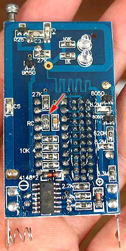 天線可以用一根長度為23厘米的導(dǎo)線直接焊接到天線孔處即可,通常天線長一些可以提高接收靈敏度,圖中紅色箭頭所指的是振蕩電阻,這里用的是270K,可以和1.2~1.5M振蕩電阻的發(fā)射器配套使用。