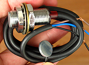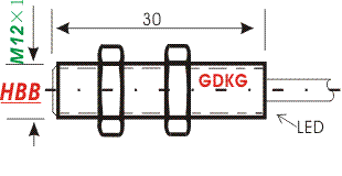 這是最常用的霍爾開關,它的直徑為12毫米,固定時只要在設備外殼上打一個12毫米的園孔就能輕松固定,長度約30毫米,背后有工作指示燈,當檢測到物體時紅色LED點亮,平時處于熄滅狀態(tài),非常直觀,引線長度為100毫米。