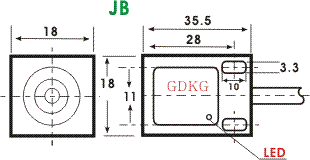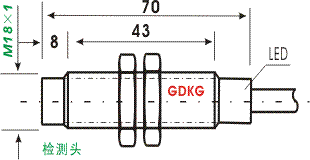 這是一種電容接近開關,主要用于檢測非金屬物,被廣泛應用到顆粒料位儀、人體接近開關等用途,它的直徑為18毫米,固定時只要在設備外殼上打一個18毫米的園孔就能輕松固定,長度約70毫米,背后有工作指示燈,當檢測到物體時紅色LED點亮,平時處于熄滅狀態(tài),非常直觀,引線長度為100毫米。