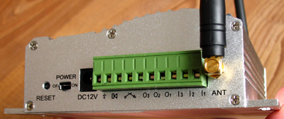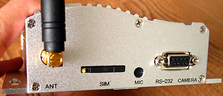 最左側(cè)的是GSM天線,接通電源之前,要先接上天線。后面的是SIM卡座,用筆尖壓一下按SIM卡座位邊的小黃點(diǎn),彈出卡座,取出卡座后把GSM卡夾好再壓入,后面是麥克風(fēng),可以監(jiān)聽環(huán)境聲音,最右側(cè)的是RS-232串口攝像頭插座,連接好串口攝像頭后請旋緊兩個(gè)固定螺絲。