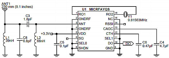 這是DF發(fā)射模塊,體積:19x19x8毫米,右邊是等效的電路原理圖
