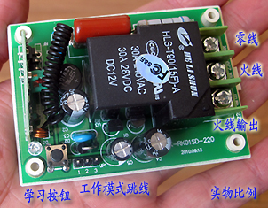 這是我們最新設(shè)計的220伏交流供電單路大功率遙控開關(guān),它采用30A的繼電器可以控制大功率用電器;可學(xué)習(xí)多達8個不同地址碼的遙控器,并且每個遙控器的所有按鍵都可以學(xué)習(xí),可以一個遙控器控制多個開關(guān),也可以多個遙控器控制一個開關(guān),操作簡單配套靈活任意組合;采用大尺寸的螺栓接線柱,便于接線能直接遙控輸出220V交流電壓使用非常方便,帶塑料外殼安裝也非常容易。